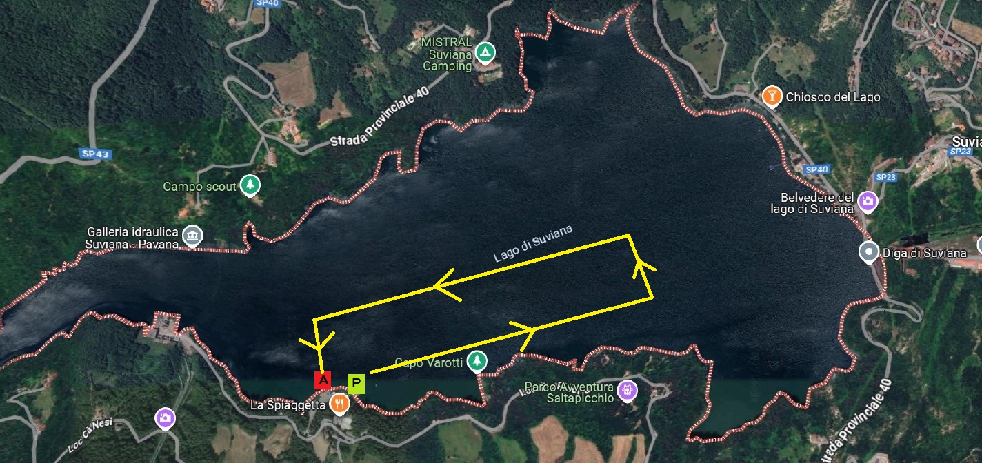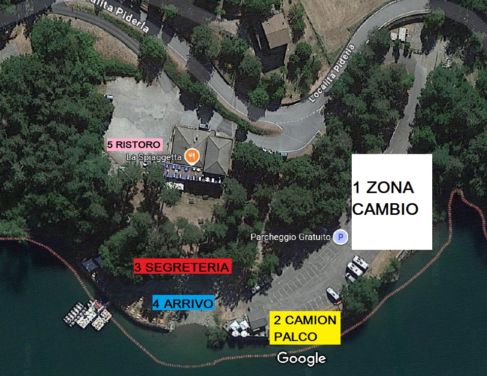 Partenza lungolago Suviana presso ristorante Spiaggetta – Locaclità Piderla, a SX gli atleti percorreranno un piccolo tratto di collegamento al circuito – da li inizia il circuito – e percorreranno altri 1000 mt fino al parcheggio sopra il centro velico, e tornare indietro ( tenendo la SX ) – il percorso dovrà essere ripetuto per n. 5 volte – al 5 LAPS si scende verso l’ arrivo.